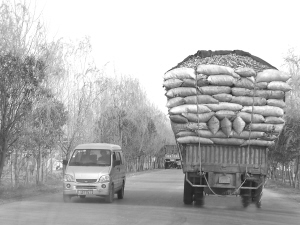 4月18日上午,一辆装载很多货物的货车缓缓行驶在鹿邑真源大道北段。由于货车超高超载,随时都有发生事故的可能,一些行人和司机见状后,纷纷避而远之。 晚报记者 侯国防 摄 线索提供 张卜山