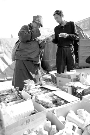 青海玉树地震发生几天后,玉树结古镇胜利路的商铺老板陆续将一些食品、饮料、生活用品等摆放在街头出售,方便群众购买。
