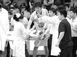 大概一刻钟后,杜锋被队友抬进休息室,医生为他挂上了氧气瓶,一名工作人员将一条大毛巾盖在他身上。还有人拿来了扇子和冰袋。杜锋的父亲和姐姐也进了休息室探望。
