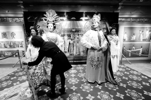 4月20日,一名工作人员在上海世博园区中国馆陕西展区整理蜡像服饰。 当日,上海世博园区启动正式开园前的第一场试运行,本场试运行将重点检验世博园区内各项运营活动和运营保障准备情况,来自社会各界约20万市民有幸成为首批入园的游客。新华社发 郑宪章 摄