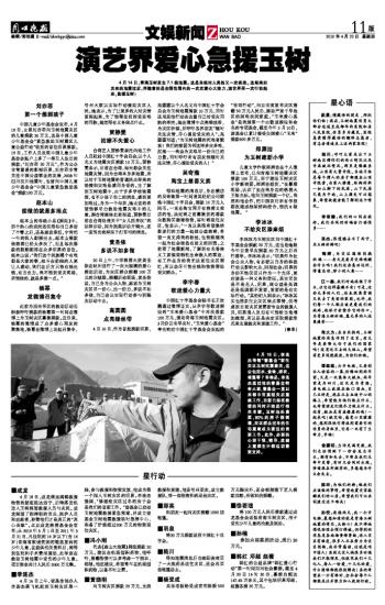 4月14日,青海玉树发生7.1级地震。这是自然对人类的又一次挑战。这场突如其来的地震过后,伴随着的是全国范围内的一次次爱心大接力,演艺界再一次行动起来,急援玉树!