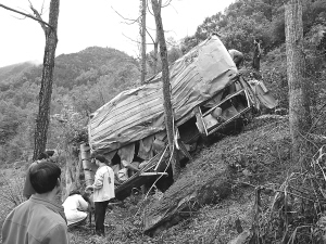 4月22日,救援人员在车祸现场施救。当日上午9时35分许,一辆牌号为桂M91502的中巴车在广西东兰县花香乡政府1公里处翻下40多米的山坡,造成7人死亡,31人受伤,其中7人重伤。据公安部门介绍,中巴车系河池市东兰县至金城江区的班车,核准座位19人,实载38人。新华社发