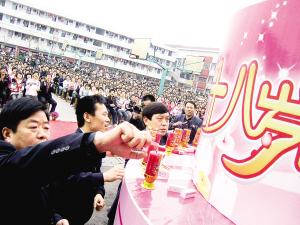 4月25日,在郸城县一高,当地教育部门领导点燃生日蜡烛后,1700多名高三学生共同分享了一个直径1.8米的巨型蛋糕,以庆祝他们跨入“18岁成年”的大门。