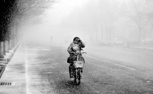 4月27日,一名行人在漫天大雪中骑行在内蒙古集宁街头。虽然已近立夏,但连日来异常的大幅降温和降雪,使内蒙古部分地区经历了严重的倒春寒天气,给生产生活带来了不利影响。 新华社发