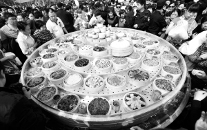 4月28日,游客在等待品尝“天下第一蒸笼”的蒸菜。当日,湖北省天门市在陆羽广场用蒸笼现场蒸菜,将当地特色美食蒸菜的8种蒸法集于一笼。据悉,该蒸笼为手工制作,直径2.8米,高1.5米,内盛八蒸168道菜,可供万人品尝。新华社发
