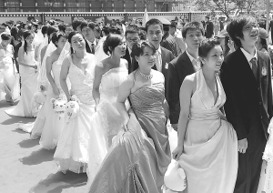 4月29日,参加集体婚礼的新人们步入婚礼现场。当日,浙江杭州市在位于高新技术开发区滨江区的白马湖畔举办大型公益动漫集体婚礼,100对远离家乡、在杭创业务工的新杭州人“情定白马湖”。据介绍,这场集体婚礼是第六届中国国际动漫节“白马湖动漫周”的系列活动之一。新华社发