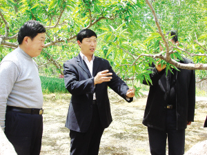 4月30日,在西华县红花镇政府东北角的一片果林中,记者见到了正为果农讲解果树春季管理知识的他(如图)。