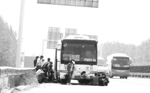 昨天,记者在宁洛高速沈丘至周口段看到,有不少人在高速路上等车。有一辆客车可能出了故障,停放在高速路边,车后方没有明显的警示标志,车前和车边有少数乘客或坐或站,很不安全。记者 孙安平 摄
