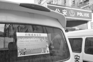 本报讯 打架也要计算成本!昨天,记者见到了市公安局沙南分局北永兴派出所推出的“打架成本公示”卡,提醒市民打架前还得考虑“成本”问题,不要为逞一时之气大动干戈,害人害己。为加大宣传力度,该所不仅把“打架成本公示”卡贴进社区、学校、企业,还把“打架成本公示”卡贴在出警的警车上。