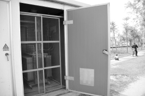 昨日下午,市区汉阳路东侧的滨河公园内,一座变电器室的门打开着,里面的变电器、电线清晰可见。这儿经常有孩子到附近玩耍嬉戏,一旦不慎触摸,后果不堪设想。希望有关部门能及时修复,消除安全隐患。