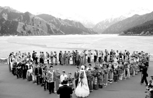 5月2日,来自全国各地56个民族的112位青年男女在天山环抱中的天池湖畔举行了隆重的集体婚礼。他们身着各民族艳丽服饰,在红地毯上排成一个巨大的心形图案。据悉,这是由新疆维吾尔自治区团委、自治区旅游局协同西藏、广西、贵州、甘肃、四川等多省区共青团共同举办的“中华56个民族一家亲·新疆天山婚礼”活动。新华社发