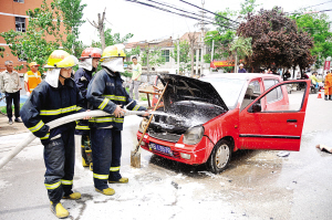 5月5日12时许,一辆红色小轿车行驶至周口市区汉阳路时,车头突然冒烟起火。接到报警,消防队员迅速赶到打开车前引擎盖,将火扑灭。所幸未造成人员伤亡。据消防队员判断,起火原因可能是轿车发动机内部的电路或油管出现了故障。
