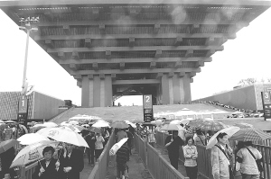 5月5日,游客在中国馆前排队准备入馆参观。当日,上海迎来世博会正式开幕以来首个降雨天气,在连续多个“高温天”之后,世博园区内的游客感觉凉爽了不少。据上海中心气象台消息,上海降雨天气将持续,局部地区雨量可达中等程度,风力依然较大,未来3至4天的最高气温将降至24至25摄氏度。新华社发