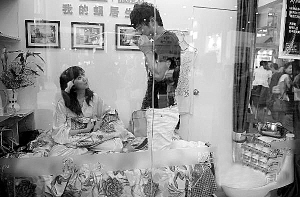 5日,一对青年男女正在成都房交会上一个约2平方米面积空间中表演蜗居秀。正在成都举行的该市第35届房交会上,开发商和相关商家们使出浑身解数,吸引购房者。