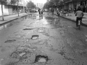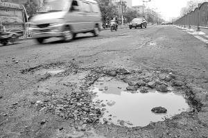 前天下午,记者驱车对市区各条路段进行了探访。从八一路一路向北驶来,记者留意了一下,该路段大大小小的坑洼处多达几十处,在与之相接的人民路和交通路附近的路段有几处还是大面积的洼坑。大致目测过去,一些坑洼处深度竟达十多厘米,一个“路坑坑”连着另一个“路坑坑”,经过时让人提心吊胆。过往的车辆因为路不好走,忽左忽右,颠簸得厉害。一辆货车因前面有一处洼坑,司机急忙变更车道,后面的车辆险些避让不及,看到旁边擦身而过的车辆,记者心里面替司机师傅们不禁捏一把汗。