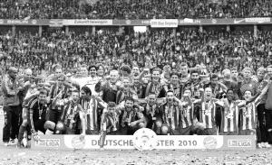 本报综合消息 德甲联赛2009-2010赛季昨天落幕,拜仁慕尼黑客场以3比1击败第34轮的对手柏林赫塔,捧起冠军奖盘,客场以0比0与美因茨互交白卷的沙尔克获亚军,不来梅夺得季军,以上三队获得欧冠参赛资格;分列四五位的勒沃库森和多特蒙德获得欧联杯的参赛资格;列积分榜后三位的纽伦堡、波鸿和柏林赫塔则降入德乙联赛。