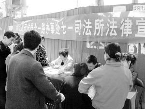 昨天上午风刮得较大,但设在新闻社区新建路与文明路交叉口处的法律咨询台,却被居民们围得严严实实(如图),大家七嘴八舌地咨询有关物业管理、遗产继承、婚姻、侵权等方面的问题。