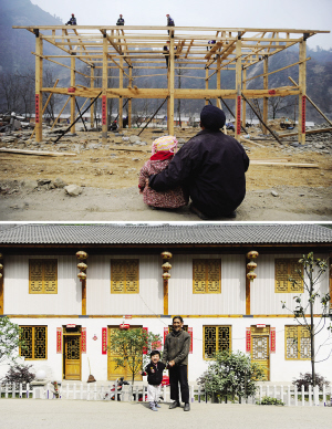 2010年4月30日,青川县关庄镇高坝社66岁区居民何朝云和自己的小孙子刘明楚在花了12万元新建的家园前合影留念。