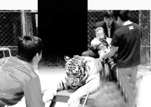 11日,记者来到该公园东侧的动物馆,这里的动物表演正在进行。在熊、狮子、猴子、狗相继表演后,百兽之王老虎上场了。一名驯养员将一大铁圈扣在老虎嘴巴上,并拿出一根大绳,将老虎从脖子到屁股来了个“五花大绑”,让刚刚还威风凛凛的老虎顿时成了任人摆布的“病猫”。正当市民不知这是演哪出戏时,驯养员打开大门,招呼游客跟老虎合影,每位20元。(华商)
