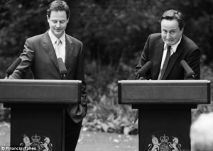 卡梅伦与克莱格的牵手,意味着英国出现第二次世界大战结束以来首个联合政府。保守党偏右翼,自民党偏左翼,政治和政策立场差异明显。有人嘲讽,两党基于实用主义缔结“没有爱情的婚姻”。有人预言,这将是一场短暂的“露水姻缘”。有人调侃,两党“性格”互补,更利“婚姻”美满。