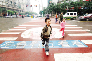 当日,“喜洋洋”“灰太狼”爱心斑马线亮相重庆市南岸区南湖路口。爱心斑马线的两端分别是“喜洋洋”和“灰太狼”的图案,图案下还写有温馨的提醒标语,提醒过斑马线的市民遵守交通规则。