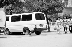 昨天上午,记者在现场看到,这几辆车停在交通中路与常青路交叉口东约100米路南,车前的玻璃上贴有出售信息,盲道被堵得严严实实。其中一辆车少了一个后轮,用一些砖块支撑着,车下有厚厚的尘土,看起来确是长期停放在这里。