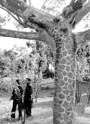 5月24日,游客从河北秦皇岛北戴河奥运公园绘有长颈鹿造型的树木旁走过。秦皇岛北戴河区为增加城市文化内涵,选择街道两侧和公园内的30余株树木,结合树干的自然形态绘上各种动物图案,妙趣横生、引人驻足。新华社发