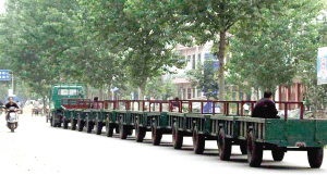 5月25日下午,一辆小货车拉着十几个四轮车斗,犹如一条长龙缓缓从商水县备战路上驶过。见前后排车斗内分别坐着一位押车员,不少路人表示担心他们的安全。晚报记者 马治卫 摄