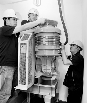 5月29日,几位电梯维修工在手动操作电梯升降设备,进行“解救电梯内被困人员”的演练。