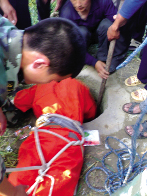 由于得不到老人的配合,增加了救援难度。于是,现场指挥员派一名身材瘦小的战士李亚杰倒悬下井施救,其他救援人员用安全绳拴住李亚杰的腰部和两只脚,将其倒悬进入井中(如图)。在距离徐老汉还有20厘米时,李亚杰用救援绳绑在徐老汉腋下,并将其拴住。随后,救援人员合力向上拉绳,经过20分钟紧张施救,成功将徐老汉救出。因抢救及时,目前徐老汉已脱离生命危险。线索提供 关雪华 刘旭
