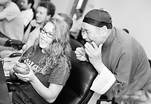 6月2日,臧鸿正在指导美国大学生学习老北京叫卖绝活。当日,“京城叫卖大王”臧鸿在北京中国现代文学馆为慕名来访的美国纽约柯盖德大学的学生们表演老北京叫卖绝活,赢得阵阵掌声。