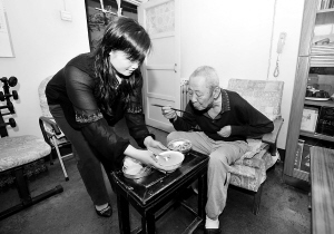 6月3日,社区工作人员将午餐送到行动不便的尹孝(右)老人家中。日前,山东济南市首家“老年饭桌”在市中区七里山街道七东社区试营业。“老年饭桌”依托社区服务中心,对老年居民实行送餐上门,解决“空巢”老人和特困家庭老人的后顾之忧。目前,“老年饭桌”已有20多位客户,每人每天只需交纳7元钱就能吃上精心搭配的营养午餐,特困家庭老人还能享受价格减半的优惠。