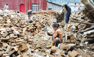 福州市仓山区一处民房被推倒后,一些手持铁镐、砌墙刀等工具的人开始从土堆里将实心黏土砖、木梁柱等旧建材挖出(5月8日摄)。