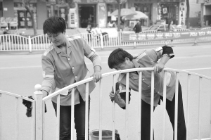 昨日,清洁工们在周口市区大庆路清洗马路护栏。为了给市民营造洁净的生活环境,有关部门便组织清洁工们走上街头清洗马路护栏。晚报记者 朱海龙 摄