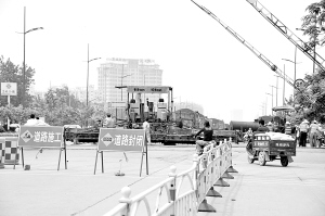 昨天,在周口迎宾大道上,工人们正忙着给路面铺油。