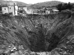 大城桥镇近年频频出现地面突然坍塌形成深不见底的巨洞现象。沉塌最严重的地方是福泉小学。小学的操场,如今已经变成一个直径约为80米的“天坑”(右图)。