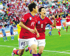 本报综合消息 昨晚,2010南非世界杯B组首轮,韩国队2-0战胜希腊。开场第7分钟,寄诚庸开出左侧任意球,李正秀后点包抄破门。第52分钟,朴智星前场断球杀入禁区巧射右下角得手。