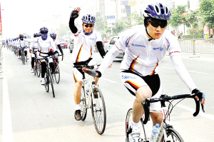 当日上午,见车友们在八一路某商店门前做出发前的热身活动,记者上前采访了车队领队朱先生。朱先生介绍,参加本次环豫骑行活动的车友有21人,来自河南各地的他们是通过网络聚集在一起的。车友年龄最大的有50多岁,最小的只有19岁。“周口是第四站。今天,我们准备骑车经过漯河和驻马店,争取20天内骑行2010公里,于6月19日返回郑州,完成环豫骑行宣传‘低碳出行’的壮举……”