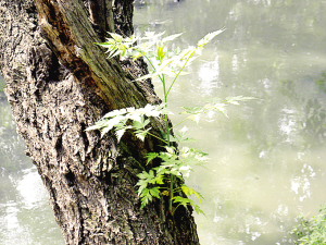 昨日,记者在柴塘村清水河小桥旁看到,一棵枯柳的树干裂缝处长出一棵高约50厘米的楝树,翠绿的羽状叶子长得郁郁葱葱。据悉,该柳树已生长30多年,不知是何原因去年枯死了。前一段时间,村民柴先生发现枯柳树上长出一棵楝树,所见之人无不称奇。