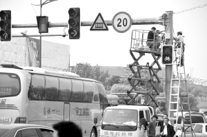 昨天,在市区一路口处,交警部门的维修人员正给红绿灯信号杆刷漆。这两年,市区不少信号杆油漆脱落并出现腐蚀现象,影响城市形象。晚报记者 朱海龙 摄