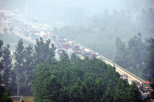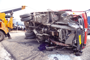 6月18日7时许,在周口大道沙颍河大桥南桥头,一辆大货车失控撞上了正在施工的铺路机,致使大货车侧翻,石子洒落一地(小图)。该事故造成桥头严重堵车,堵车长龙接近2公里(大图)。在随后赶来的交警的指挥下,直到中午时分交通才恢复正常。晚报记者 朱海龙 摄