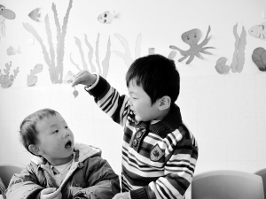 有一次放学时间,老师们有的帮小朋友整理书包,有的给小朋友梳头发穿衣服,我也忙着给小朋友洗脸搽香香。正忙碌间,忽然听到一阵“哗哗”的水流声,我连忙跑到洗手间,天哪!陈煜森正领着杨盛渊、麦兜、刘留等几个宝宝在玩水呢!他们的衣服袖子湿得一塌糊涂,小手冻得像胡萝卜似的通红通红,地板上也已经是水流成灾。我大声嚷道:“陈煜森,你干什么呢?”其他小朋友听到我叫,赶快退后几步,陈煜森扭头看看我,依然用小手打着水花说:“老师,你看,漂不漂亮?”我一下子哭笑不得,班车快出发了,我没时间给他讲道理,想着明天来了再教育他,只管把他们几个拉到睡眠室,用吹风机把湿了的袖子一一吹干,慌慌张张地送到班车上,但还是晚了5分钟。唉,这个小家伙!