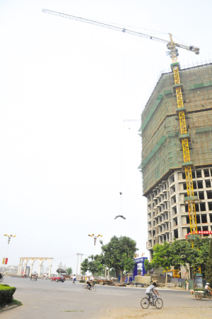 昨天记者发现,周口市区某建筑工地上的塔吊的吊臂不时转向马路吊运材料。吊臂之长,横跨人行道与机动车道。该施工现场未见有任何安全措施预防高空坠物。
