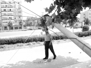 昨日,一名行人小心翼翼地通过倾倒的电线杆。位于西华县迎宾大道附近的一根电线杆倾倒,严重影响着过往行人的安全。 晚报记者 高洪驰 摄