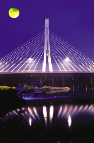昨晚,初次亮灯的沙颍河大庆路大桥在月光的映衬下,显得格外迷人(照片多次曝光)。大桥即将通车,这几天晚上,都有不少市民赶到这里,争睹壮美的沙颍河大庆路大桥。晚报记者 朱海龙 摄