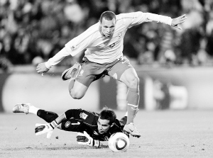 几乎与前天阿墨之战的进程如出一辙,丢球后的智利人也大举压上,后防留下了更多空当,巴西人耐心地打起了快速反击。第一次反击,巴西人连续3脚流利传递,但法比亚诺最后的脚后跟传球错失机会。大意的智利人仍然没有警惕,于是随即就尝到了苦头,第37分钟,巴西队打出犀利反击,罗比尼奥内切后分给卡卡,卡卡禁区前沿直传法比亚诺,后者反越位成功过掉门将轻松推射得手。带着2比0的优势进入下半场,巴西人与前天的阿根廷一样早早扼杀了胜负悬念。不仅比赛进程与昨日阿墨之战相同,就连球队核心的发挥也十分类似。卡卡与梅西都是世界足球先生,赛前都被球迷寄予厚望。然而两人仿佛同时在本届杯赛上忘穿射门靴,打了4场比赛,两人都还没有斩获。但不进球不代表没威胁,两人充分发挥出了进攻核心的作用,从终结者变成了助攻者,给对手的威胁更加大。1/8决赛,两人都给自己增添了助攻数据,为他人作嫁衣的足球先生们更可怕。