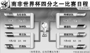欧洲联手非洲对抗南美,鹿死谁手,尚未可知。巴西在四分之一决赛中的对手是荷兰,而阿根廷则要面对德国,两场世界级的碰撞谁都没有把握。当然,欧洲最放心的突破口,还是在巴拉圭。