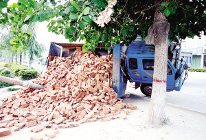 6月29日5时许,一辆往鹿邑赵村拉砖的农用车行驶至该县县城西关时,因司机疲劳驾驶,拉砖车突然失控,一头撞向路边的路灯杆和电线杆,使车上砖头洒落一地。所幸没有造成人员伤亡。晚报记者 侯国防 通讯员 胡洪涛 摄