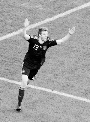 当很多人还没有完全落场坐定,身着客场球衣的德国人已经率先进球了——157秒,托马斯·穆勒!门前的一个轻点,德国的战车不仅仅是力量,更有技巧,这样早早的一个进球让马拉多纳永远记住这个名字:就在整整4个月前,德国人在主场0比1输给阿根廷,当时的国家队新人穆勒被心高气傲的老马挤兑而离开了新闻发布会;如今在非洲大陆的南端,穆勒用自己的轻轻一跃,还给了老马一个答案:距离1986年已经太远,24年来的世界杯上,阿根廷怎能赢过德国?