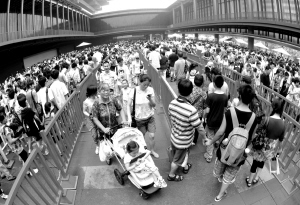 7月5日,游客在排队参观中国省区市联合馆。